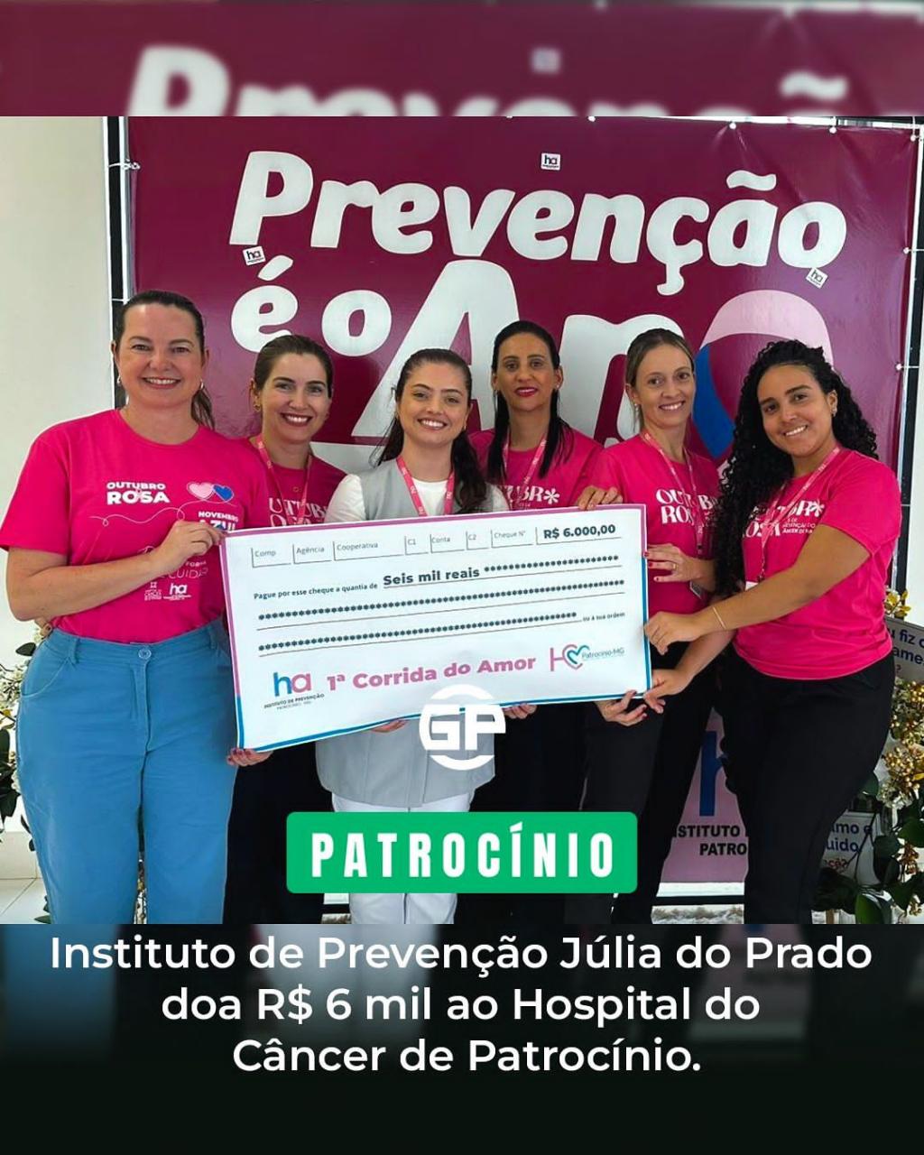 O Hospital do Câncer de Patrocínio/MG recebeu nesta semana a doação de R$ 6.000,00 (seis mil reais) do Instituto de Prevenção Júlia do Prado. O valor foi arrecadado durante a 1ª Corrida Outubro Rosa, realizada em 4 de outubro, que foi um grande sucesso de participação e engajamento da comunidade.