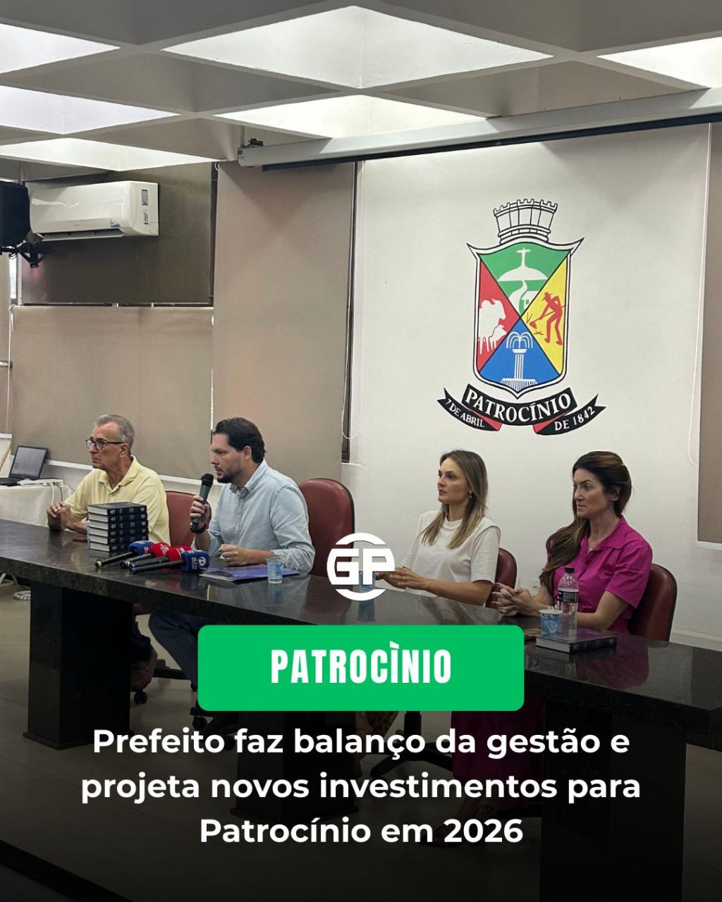 O prefeito de Patrocínio, Gustavo Brasileiro, realizou nesta terça-feira uma coletiva de imprensa para apresentar um balanço detalhado das ações da administração municipal e anunciar projetos estratégicos que irão nortear o primeiro semestre de 2026. A coletiva contou com a presença do vice-prefeito Maurício Cunha, da primeira-dama Gabriela Guimarães, além de secretários municipais, assessores e servidores públicos.
