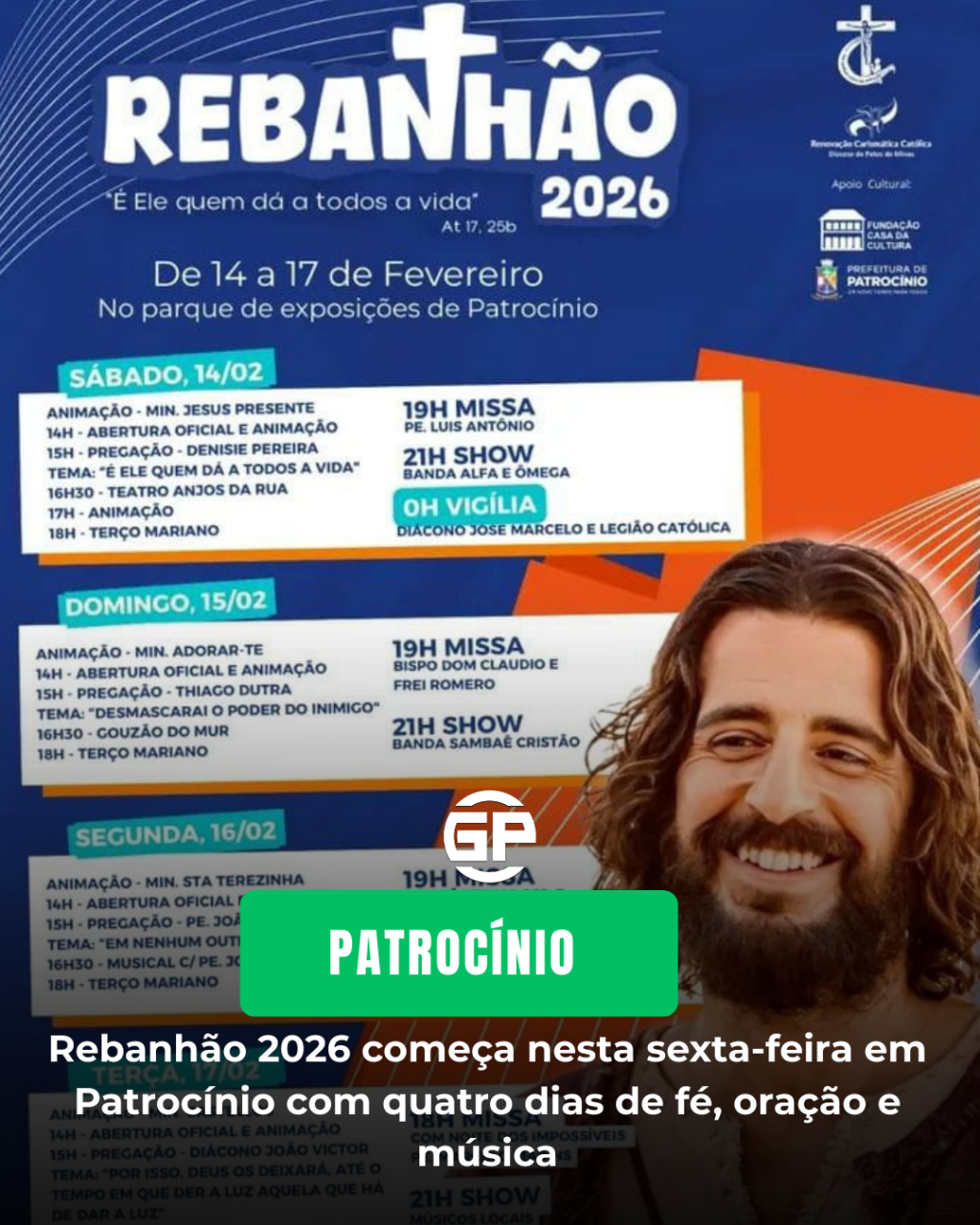 Segundo o prefeito, estão na programação o grupo Morada, que é conhecido nacionalmente no cenário da música cristã contemporânea, além de duas atrações católicas: a banda Colo de Deus e o padre Chrystian Shankar, sacerdote mineiro com grande destaque nas redes sociais e em eventos religiosos por todo o Brasil.