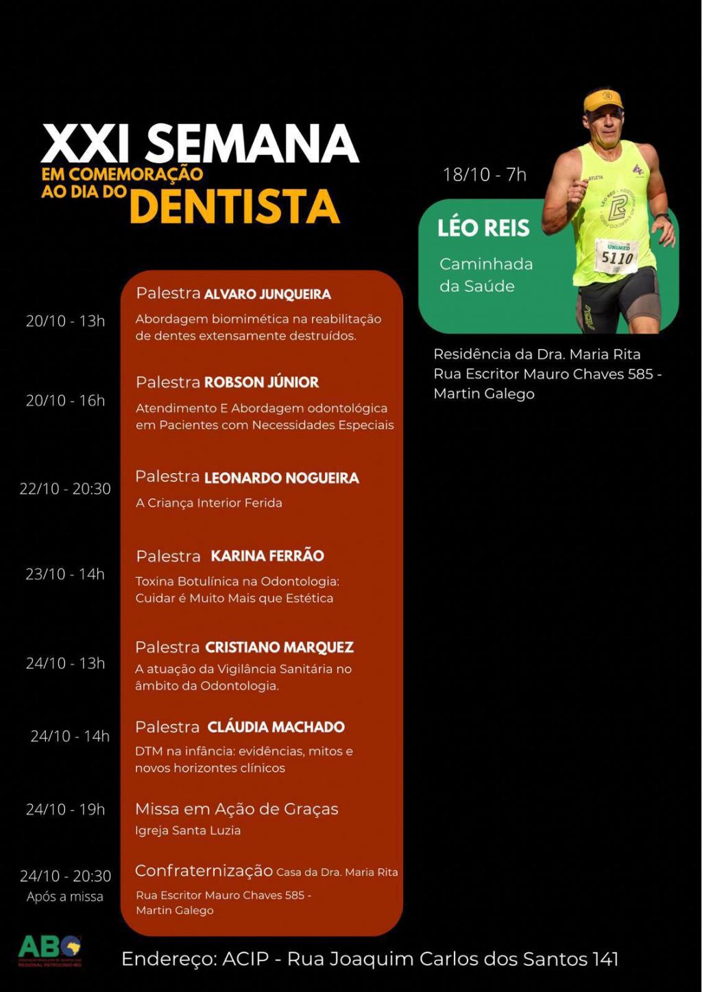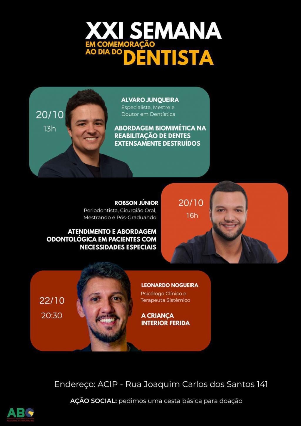 Entre os dias 18 e 24 de outubro, a ABO Regional Patrocínio realiza a XXI Semana em Comemoração ao Dia do Dentista, reunindo profissionais da odontologia para uma programação científica e social. O evento tradicional busca valorizar a categoria, promover atualização técnica e aproximar os cirurgiões-dentistas da comunidade.