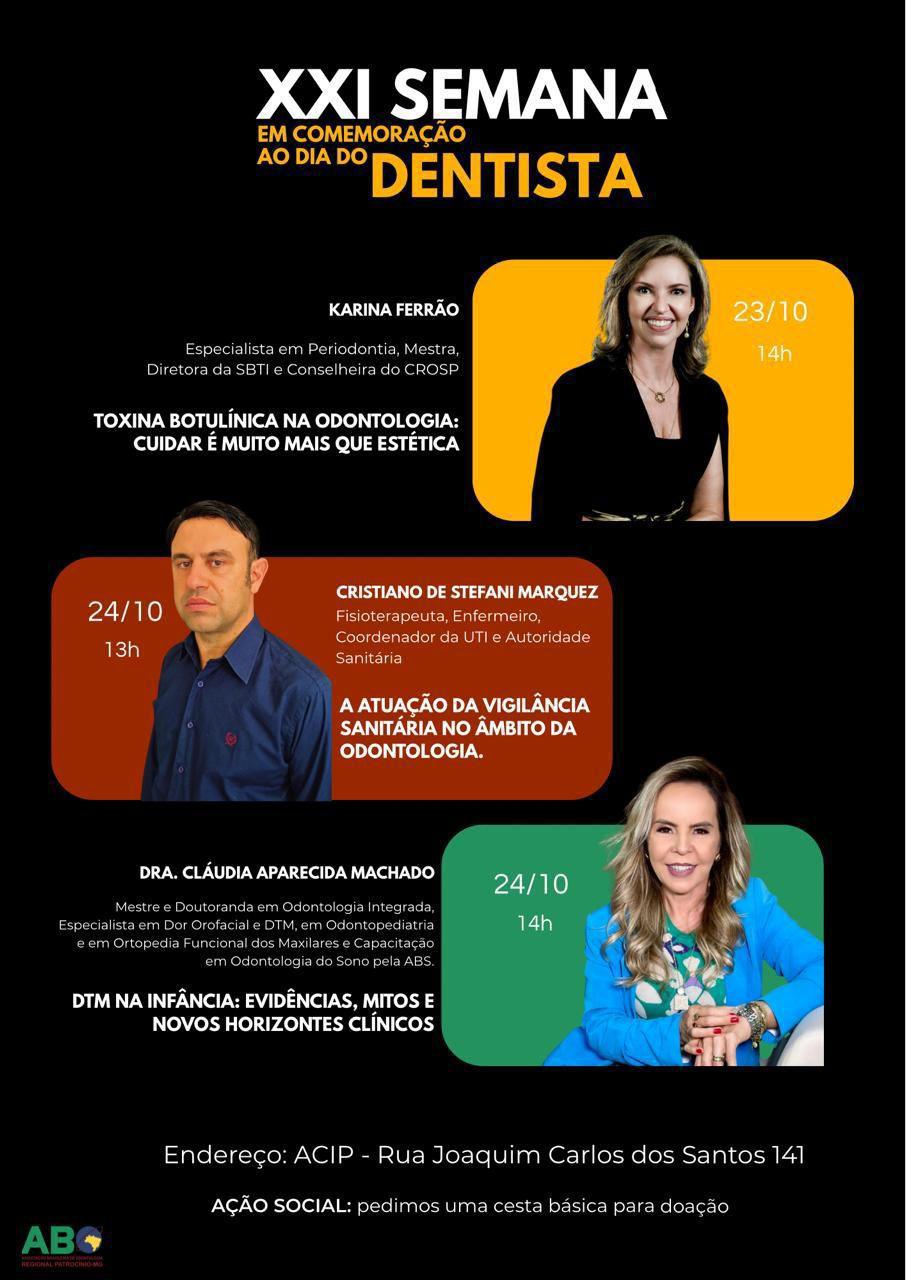 • 23/10 (quarta-feira) – Palestras “Toxina Botulínica na Odontologia” e “Vigilância Sanitária”